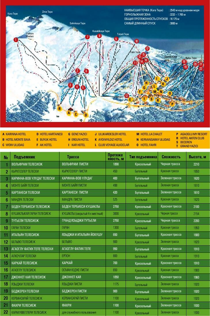 Курорт (Турция Улудаг) располагает двадцатью двумя подъемниками, общий километраж всех трасс составляет порядка семнадцати километров, самая протяженная трасса - три километра. Высшая точка находится на высоте около 2,5 километров, нижняя – 1,8. У каждой гостиницы имеются свои подъемники, в некоторых гостиницах пользование подъемниками уже включены в стоимость проживания. Можно купить абонемент, с разными сроками действия, на пользование всеми подъемниками.